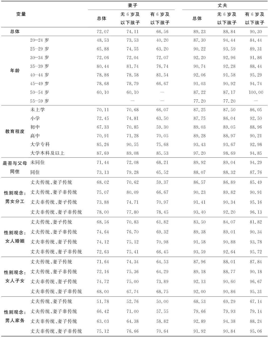 纵观既往关于性别角色观念对于家务劳动、劳动参与的影响,基本上是以研究对象个体的性别观念为核心考量。本文将从夫妻配对、动态关系的视角出发,考察性别角色规范对于劳动参与的影响,夫妻性别角色观念的状况及其差异,即使在同样的制度、物质环境和资源情况下,其对劳动参与的影响可能也会有所差别。