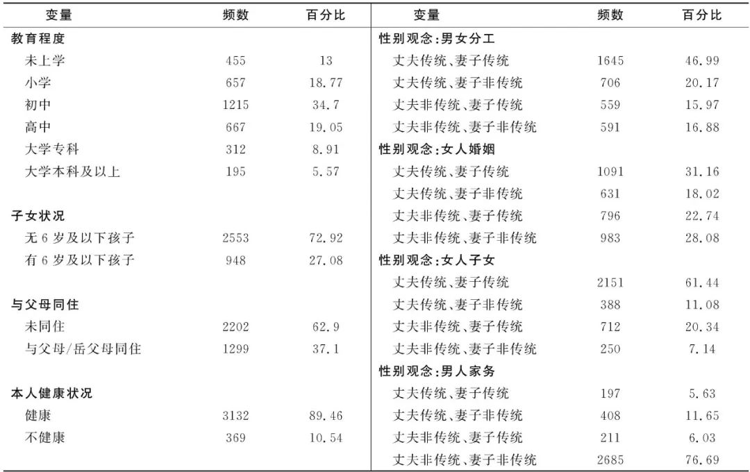 CFPS2014调查问卷从四个方面测量了性别角色观念。一是男女分工,测量的问题为“男人应该以事业为主,女人应该以家庭为主”;二是女人婚姻,测量的问题是“干得好不如嫁得好”;三是女人子女,测量的问题是“女人应该有孩子才算完整”;四是男人家务,测量的问题是“男人应承担一半家务”。调查问卷对上述性别角色观念问题提供了五项选择:非常不同意、比较不同意、说不清、比较同意、非常同意。对于前三个问题,越是不同意,越是倾向于认同现代性别角色模式;越是同意,则越是倾向于认同传统性别观念。对于男人家务观念的测量则正好相反。以男女分工为例(其余类推),根据妻子本人和丈夫的相应回答,将回答比较同意和非常同意者界定为传统,其余的界定为非传统,可以区分四种夫妻性别观念的类型,即“丈夫传统、妻子传统”“丈夫传统、妻子非传统”“丈夫非传统、妻子传统”“丈夫非传统、妻子非传统”。“传统”与“非传统”只是一种对于性别观念趋向的大致测量,而不是认为性别观念在“传统”与“现代”之间可以截然区分。