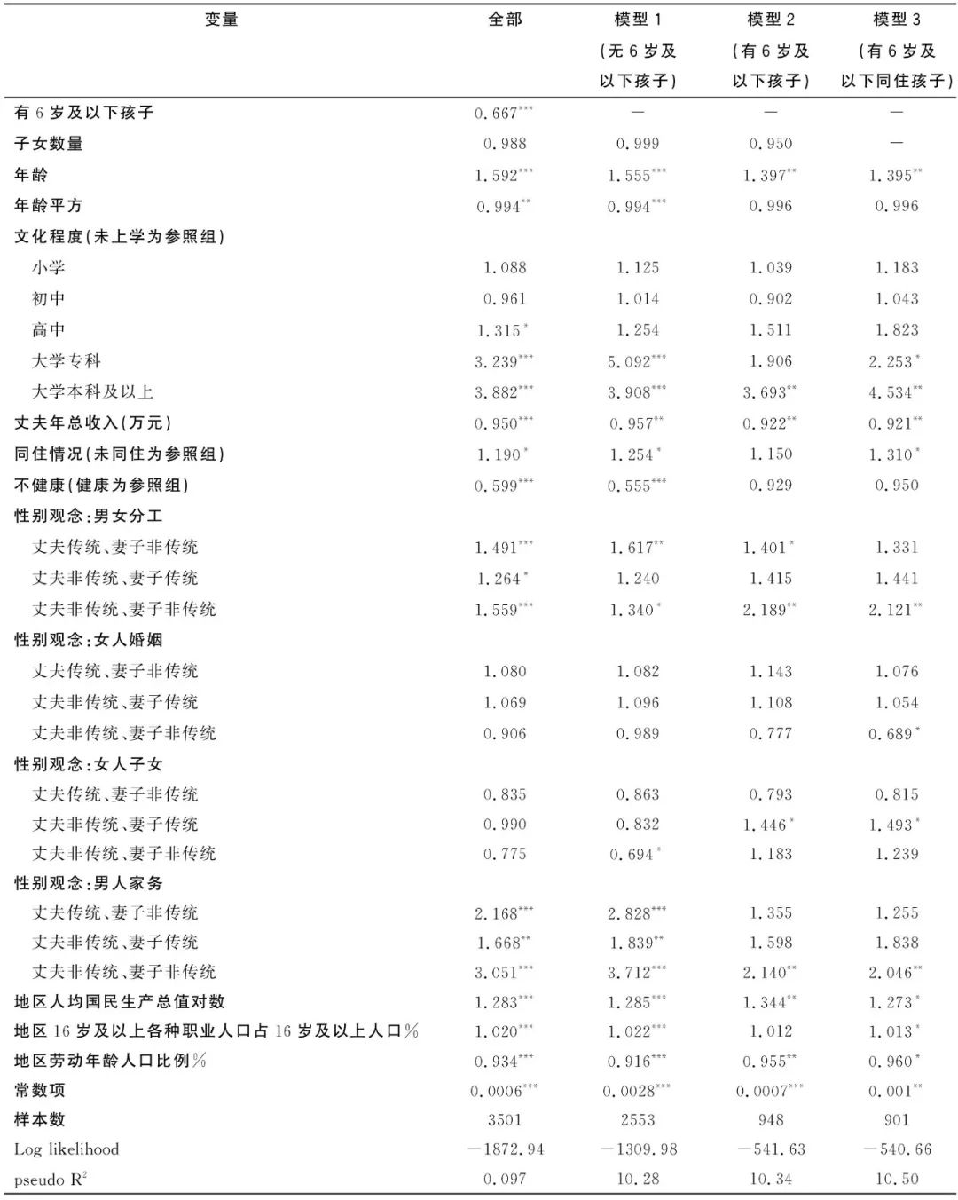 模型(全部样本)显示,夫妻关于“干得好不如嫁得好”与“女人应该有孩子才算完整”的性别角色观念,在控制其他要素的情况下,并不对已婚女性劳动参与产生显著影响。劳动性别分工的认知对女性劳动参与有显著影响,具有现代的性别分工意识是家有6岁及以下孩子的女性劳动参与的重要影响因素,丈夫拥有现代的性别分工观念同样具有重要的支持作用。
